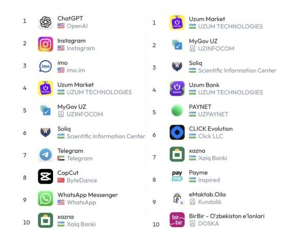 Еще одна большая тенденция — финтех. Именно таких приложений в рейтинге больше всего: Uzum Bank, xazna, Paynet, Click, payme…