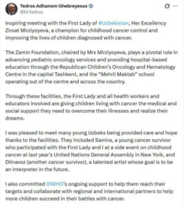 Делясь своими впечатления в социальной сети X, глава ВОЗ назвал встречу «вдохновляющей», а Зироат Мирзиёеву — «борцом за борьбу с детским раком и улучшение жизни детей, которым поставлен диагноз «рак».